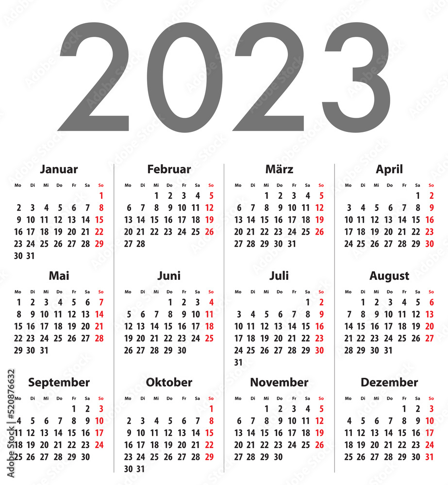 German Calendar German (Deutsch) Calendar grid for 2023. MF Stock Vector | Adobe Stock: WIESBADEN – In April 2024, German exports were up 1.6% and imports rose by 2.0% on a calendar and seasonally adjusted basis compared with March 2024. Based on provisional data, the Federal Statistical . England have been drawn against Serbia, Slovenia and Denmark in Group C; Scotland have been drawn against Germany, Switzerland and Hungary; Euro 2024 kicks off in Munich on June 14; final takes place .